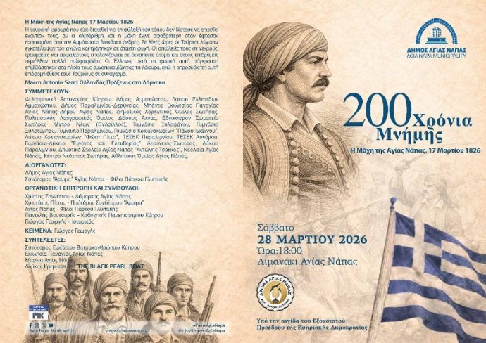 Το Περιφερειακό Γυμνάσιο Ξυλοφάγου συμμετείχε ενεργά στην επετειακή εκδήλωση για τα 200 χρόνια μνήμης της Μάχης της Αγίας Νάπας, τιμώντας την ιστορική αυτή στιγμή της Ελληνικής Επανάστασης στην Κύπρο.