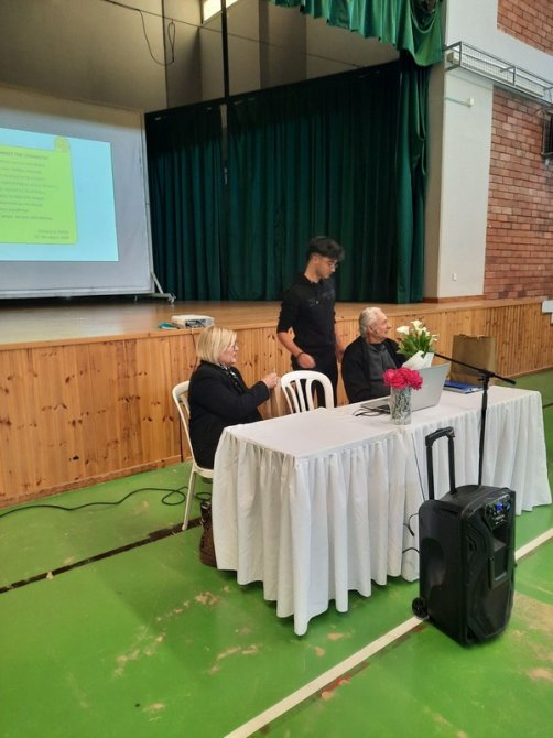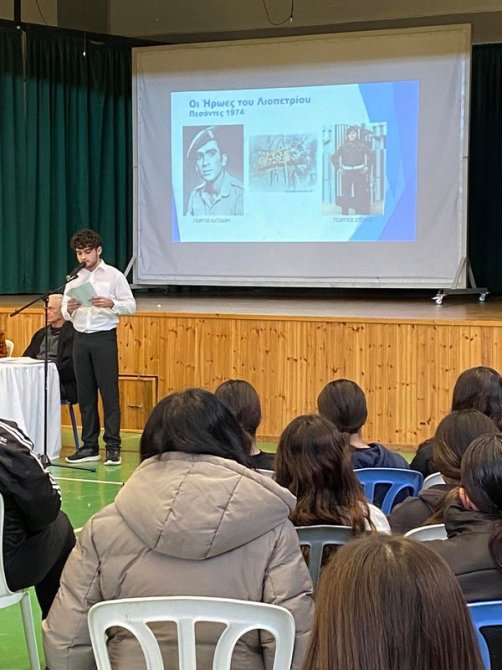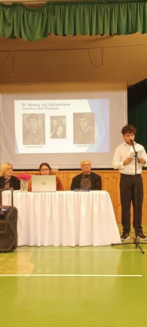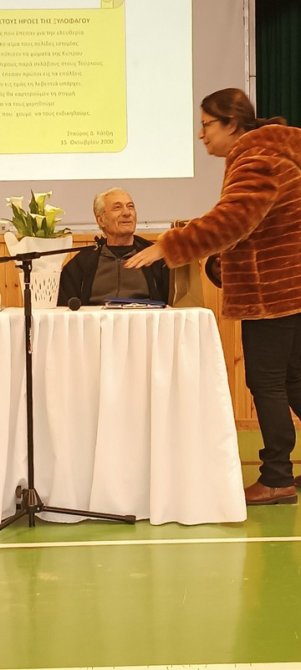Με ιδιαίτερη τιμή υποδεχτήκαμε σήμερα στο σχολείο μας τον κύριο Σταύρο Κάτζιη, Πρόεδρο της Επιτροπής των Συγγενών Πεσόντων και Αγνοουμένων Ξυλοφάγου. Ο κύριος Σταύρος παρουσίασε στα παιδιά της Β' και Γ' τάξης την προσωπική του μαρτυρία για τη συμμετοχή του στη μάχη του Άγιου Παύλου τον Αύγουστο του 1974. Η δραστηριότητα διοργανώθηκε από την Επιτροπή Εορτασμών και Εκδηλώσεων – Μνήμης Κατεχομένων στο πλαίσιο του 2ου στόχου του ενιαίου σχεδίου βελτίωσης της σχολικής μονάδας «ΔΕΝ ΞΕΧΝΟΥΜΕ, ΤΙΜΟΥΜΕ ΚΑΙ ΑΓΩΝΙΖΟΜΑΣΤΕ»: 50 χρόνια από την τουρκική εισβολή και 70 χρόνια από την έναρξη του απελευθερωτικού αγώνα 1955-59. |